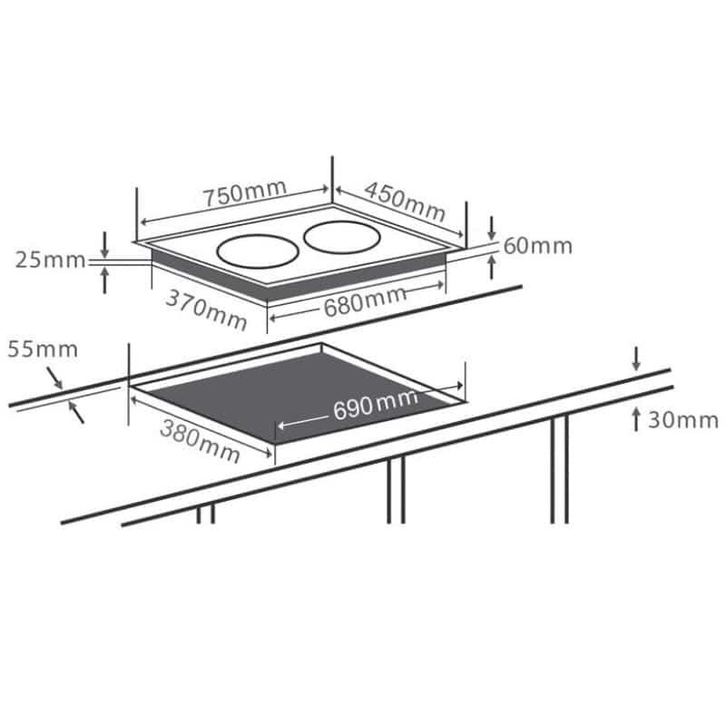 Bếp từ Chefs EH-DIH890N có kích thước (DxRxC): 750 x450 x60mm. Kích thước khoét đá (DxR): 690x 38mm. Nếu so sánh với kích thước phổ thông bếp gas, điện kiểu cũ, Chefs EH-DIH890N có thể dễ dàng dàng thay thế mà không phải cắt hay sửa đá nhiều. Kích thước này cũng hoàn toàn nằm trong kích thước tiêu chuẩn đối với bếp từ đôi, phù hợp với mọi không gian bếp.