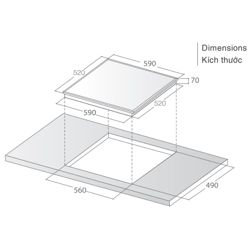 – Kích thước khoét đá: 560 x 490mm